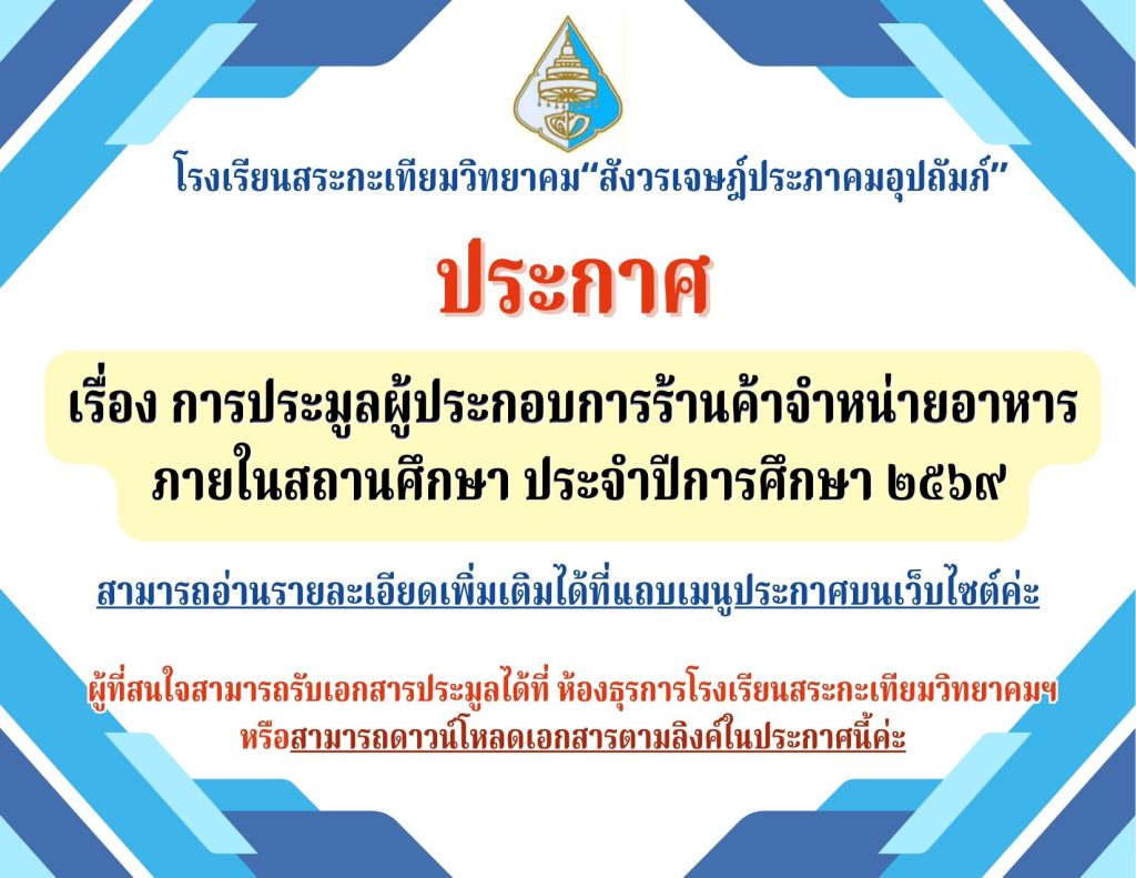 ประกาศ เรื่อง การประมูลผู้ประกอบการร้านค้าจำหน่ายอาหาร ภายในสถานศึกษา ประจำปีการศึกษา ๒๕๖๙